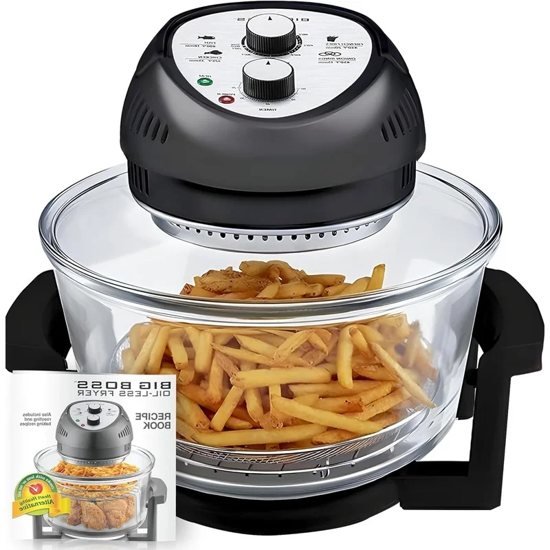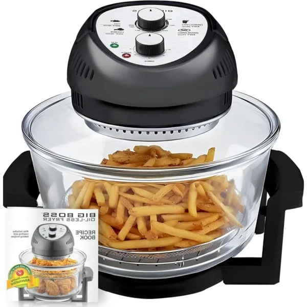 Discover the 16Qt Air Fryer Oven, your all-in-one solution for healthier cooking in a stylish black finish. This versatile air fryer doubles as a toaster oven and combines halogen, convection, and infrared technology, ensuring food is cooked perfectly crispy on the outside while remaining juicy inside—without the need for added fats or oils. Its 1300W power enables quick and even cooking, eliminating the need for pre-heating. From roasting turkey, baking fish, and grilling meats, to air frying crispy chicken, this cooker does it all. See your food cook with ease through the transparent glass bowl, making adjustments simple without losing heat. Perfect for any kitchen, its elegant copper color enhances your decor while it simplifies meal preparation and ensures delicious results.