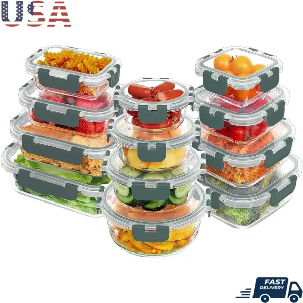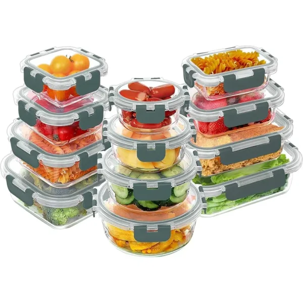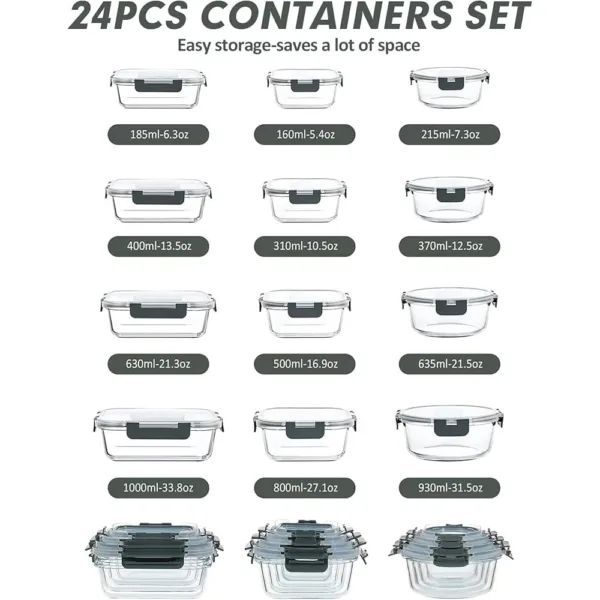 24 PIECE GLASS FOOD CONTAINERS SET: 12 glass food storage containers with 12 lids with 12 various sizes and 3 shapes for meal prep, office lunches, leftovers, portion control, bringing to the gym, picnics, travel and more. Package includes: 1 (33. 8 oz) 1 (21. 3oz ) 1 (13. 5oz ) 1 (6. 3 oz)1 (27. 1 oz) 1 (16. 9 oz) 1 (10. 5 oz) 1 (5. 4 oz) 1 (31. 5 oz) 1(21. 5 oz) 1 (12. 5oz ) 1 (7. 3 oz) glass lunch containers with locking lids. They stack together and take up less space