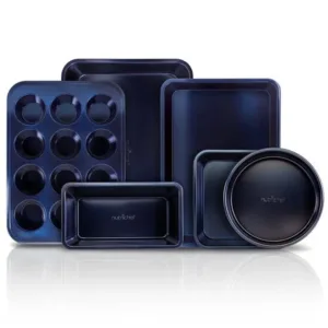 Includes a cookie sheet, wide baking pan, square baking pan, muffin pan, loaf pan, and round cake pan