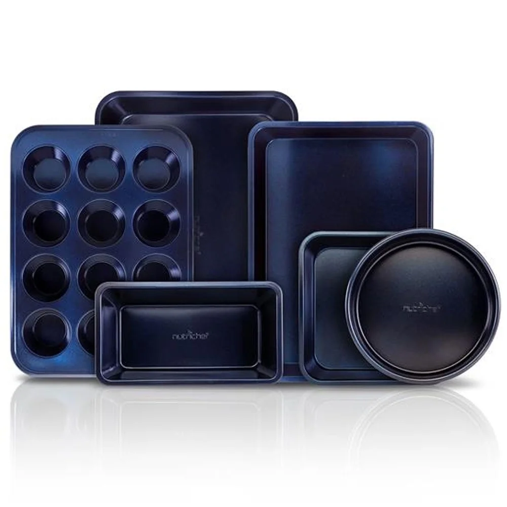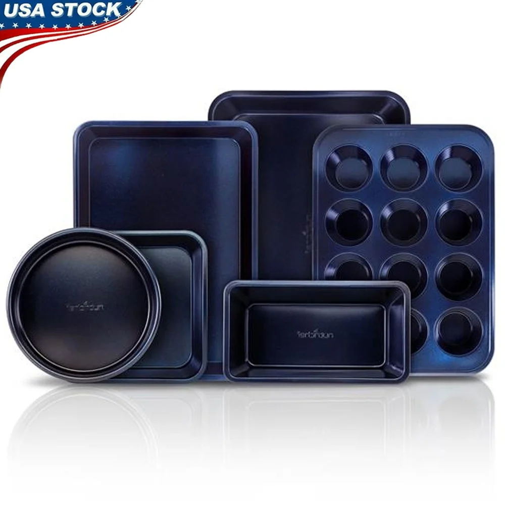 Whip up perfectly browned muffins, cakes, cookies, bread loaves, brownies, and more with the 6 Piece Non Stick Kitchen Oven Carbon Steel Baking Pans. This set of kitchen baking essentials includes a muffin pan, a round cake pan, a loaf pan, a cookie sheet, a square baking pan, and a wide baking pan. Each piece is crafted from thick carbon steel and features a dazzling blue diamond finish. A non-stick coating and dishwasher-safe design makes clean-up a breeze. The set is oven-safe up to 446 degrees, perfect for baking browned chicken breast and pork chops as well as souffles. The baking pan set is FDA-approved for commercial use and is free of lead, PFOA, PFOS, and PTFE, making them safe for all food applications in any kitchen. Keep your home filled with freshly baked goods thanks to the 6 Piece Non Stick Kitchen Oven Carbon Steel Baking Pans.