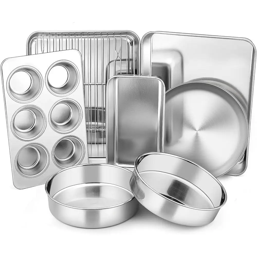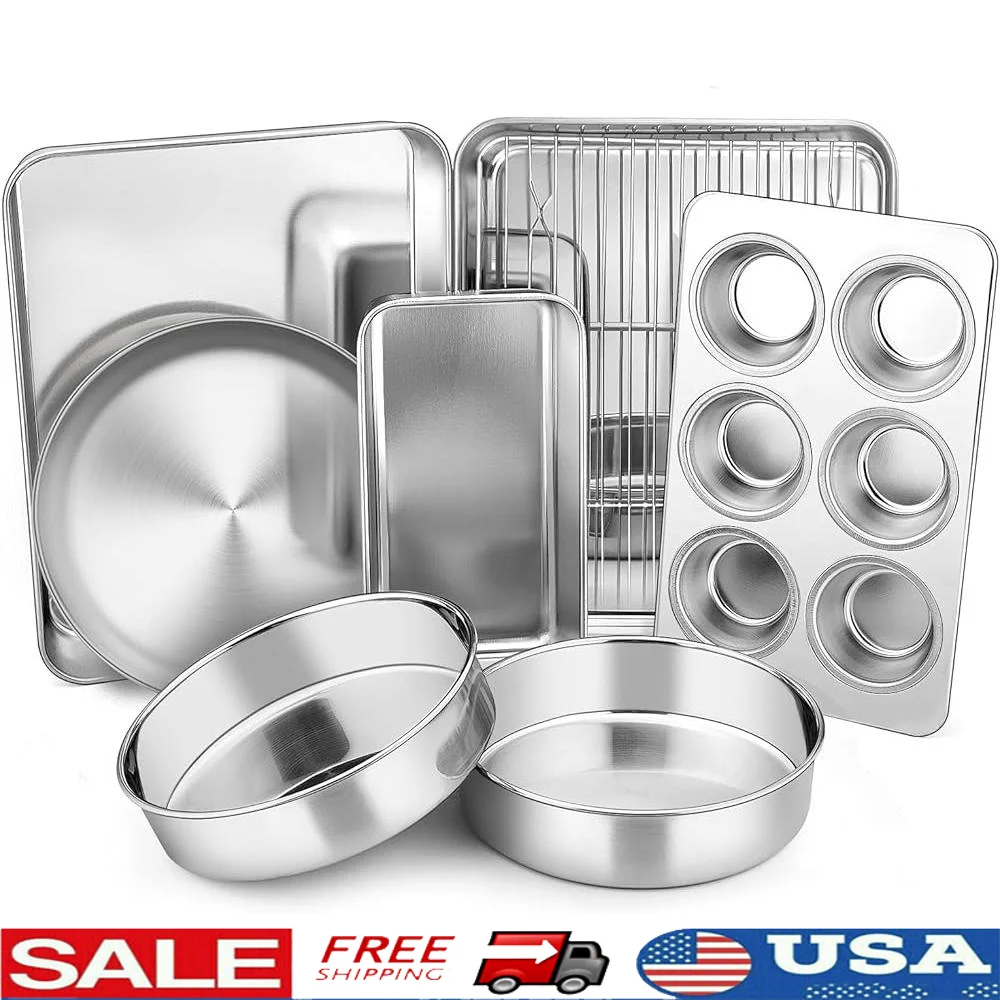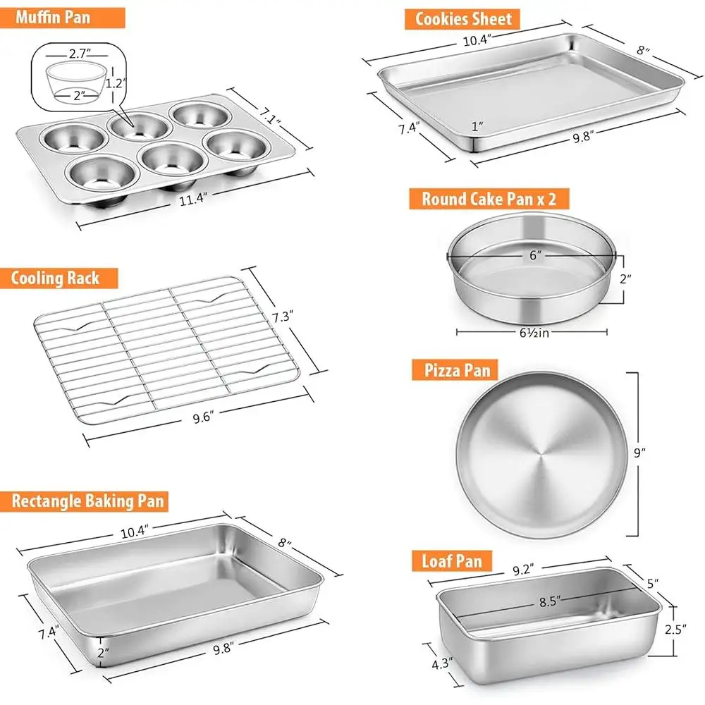 About this item VERSATILE SET – 8-piece includes the most popular and usual bakeware set: 6×2 Inch Round Cake Pan Set of 2, 9. 8×7. 4×2 Inch Lasagna Pan, 9. 8×7. 4×1 Inch Cookie Sheet with Cooling Rack, 8. 5×4. 3 x2. 5 Inch Loaf Pan, 11. 4×7. 1 Inch Muffin pan, 9 Inch Pizza Pan HEALTHY MATERIAL – Made of food-grade stainless steel without coating prevents harmful substances produced during high temperature baking, Great replacement to aluminum cake pan/non-stick coating pan, Healthy for daily baking use SUPERIOR CRAFTED – Constructed by thick gauge steel, Will not warp, chip or crack, Provides even heat distribution and long-lasting service life, Smooth Rolled edge for comfortable and safe holding, Round pan with straight-sided design gives you uniformly flat cakes EASY CLEAN – Highly polished surface always looks like new and easy to cleanup, Seamless design and round corner make food no dead corner to trap, Solid construction can stand up to high heat and repeated washing, Dishwasher safe to make a clean breeze ALL-PURPOSE – Meet most of your baking needs, Create a wide variety of delectable treats – from cookies and muffins, cupcakes, loaves to cinnamon rolls, brownie, casserole, pizza, Also great for roasting chicken, meat, beef and etc, Well fit in toaster or countertop oven, Idea gift for Christmas, Thanksgiving Day