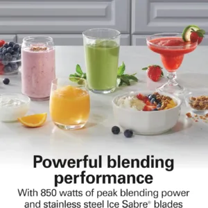 6. POWERFUL BLENDING PERFORMANCE: With 850 watts of peak blending power and stainless steel Ice Sabre blades, this smoothie blender provides all the power you need to crush ice and cut through tough, hard ingredients with ease.