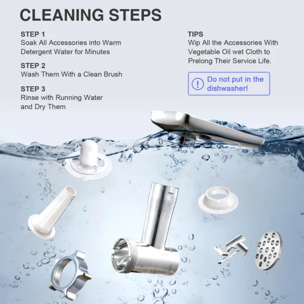Easy cleaningThe meat grinder is easy to clean, accessories can be removed, please clean all parts with warm water. Note: Do not be washed in the dishwasher. |