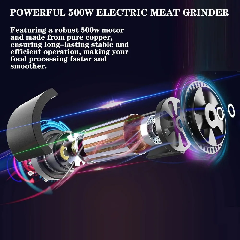 Equipped with a robust all-copper 500W motor, our meat grinder ensures powerful, consistent performance and superior durability, processing foods faster and more efficiently than standard motors.