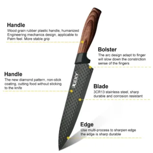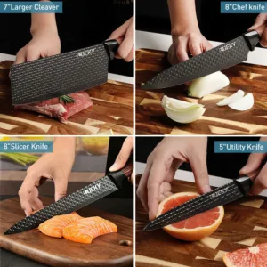 Durable:The cutlery grade steel with 58 Rockwell hardness used to make the knife blades neither rusts, corrodes nor discolors. You are still expected to hand-wash the knives and Stay dry to maintain the appearance. Precision forging creates a durable knife.