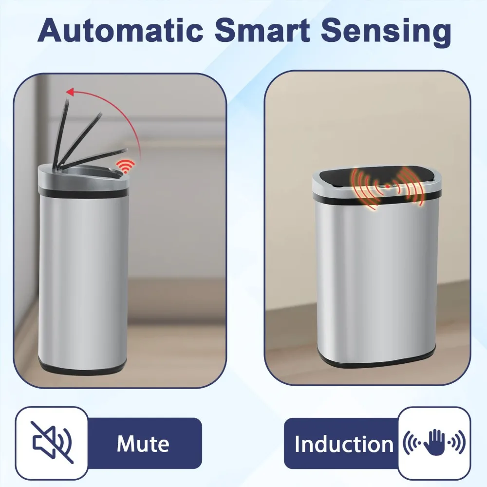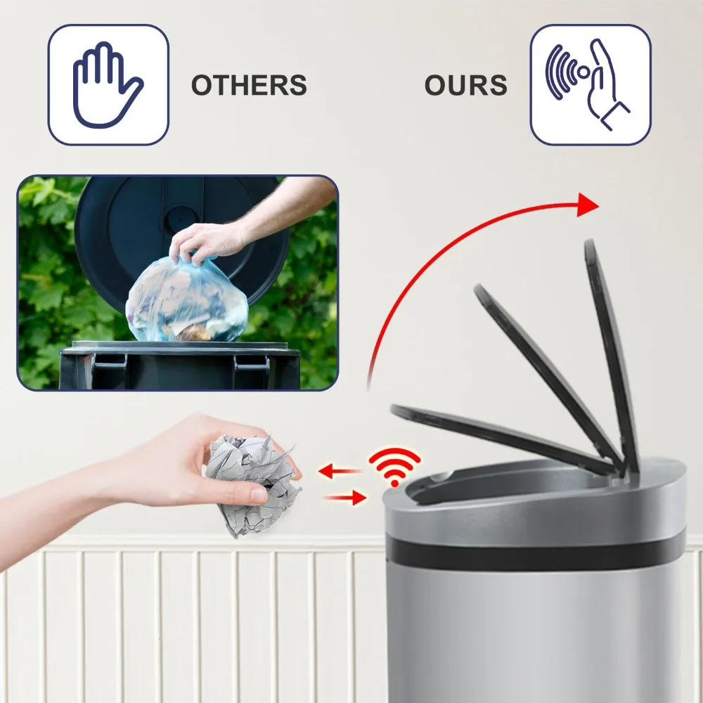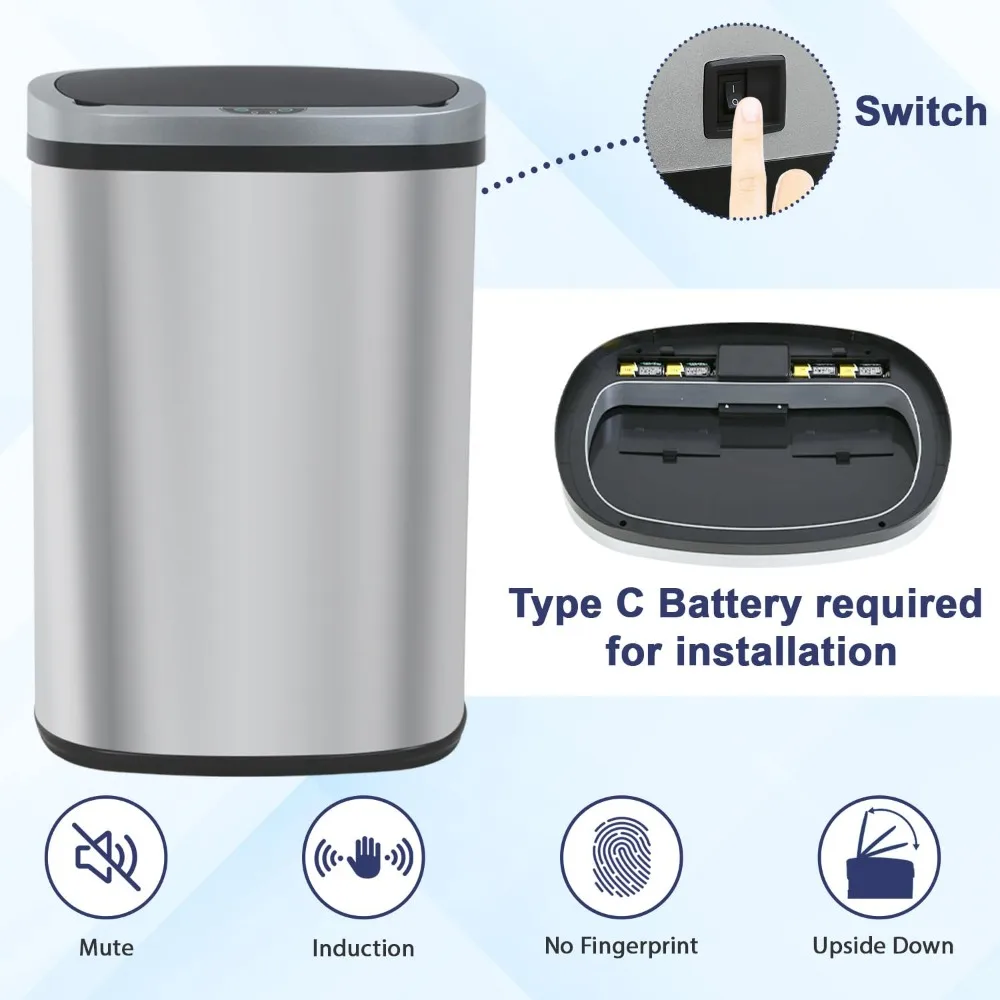 【Touchless Convenience】: Say goodbye to messy handprints and hello to a cleaner lifestyle! smart motion sensor trash can opens with just a wave of your hand, transforming your space into a touch-free environment that’s both convenient and hygienic. Requires 4 C batteries (batteries not included). 【Stylish Design】: Elevate your home decor with this automatic trash can that features sleek curves and classic color options. It effortlessly complements modern and traditional aesthetics, adding a touch of elegance to your kitchen or bathroom. 【Durable Materials】: Built to last, kitchen waste bin is made from high-quality stainless steel with a brushed finish that resists moisture. Perfect for kitchen and bathroom use, this garbage can stays looking new even in steamy environments. 【Easy to Clean】: Tired of stubborn stains? touchless trash bin comes with a fingerprint-resistant surface that makes cleaning a breeze. Just wipe it down with a damp cloth, and say farewell to pesky odors with its airtight lid! 【Quiet Closure Feature】: Enjoy peace and quiet with the soft-closing lid of our stainless steel garbage can. Thanks to its built-in buffer, the lid closes gently and silently—no more clattering noise to disturb your family!