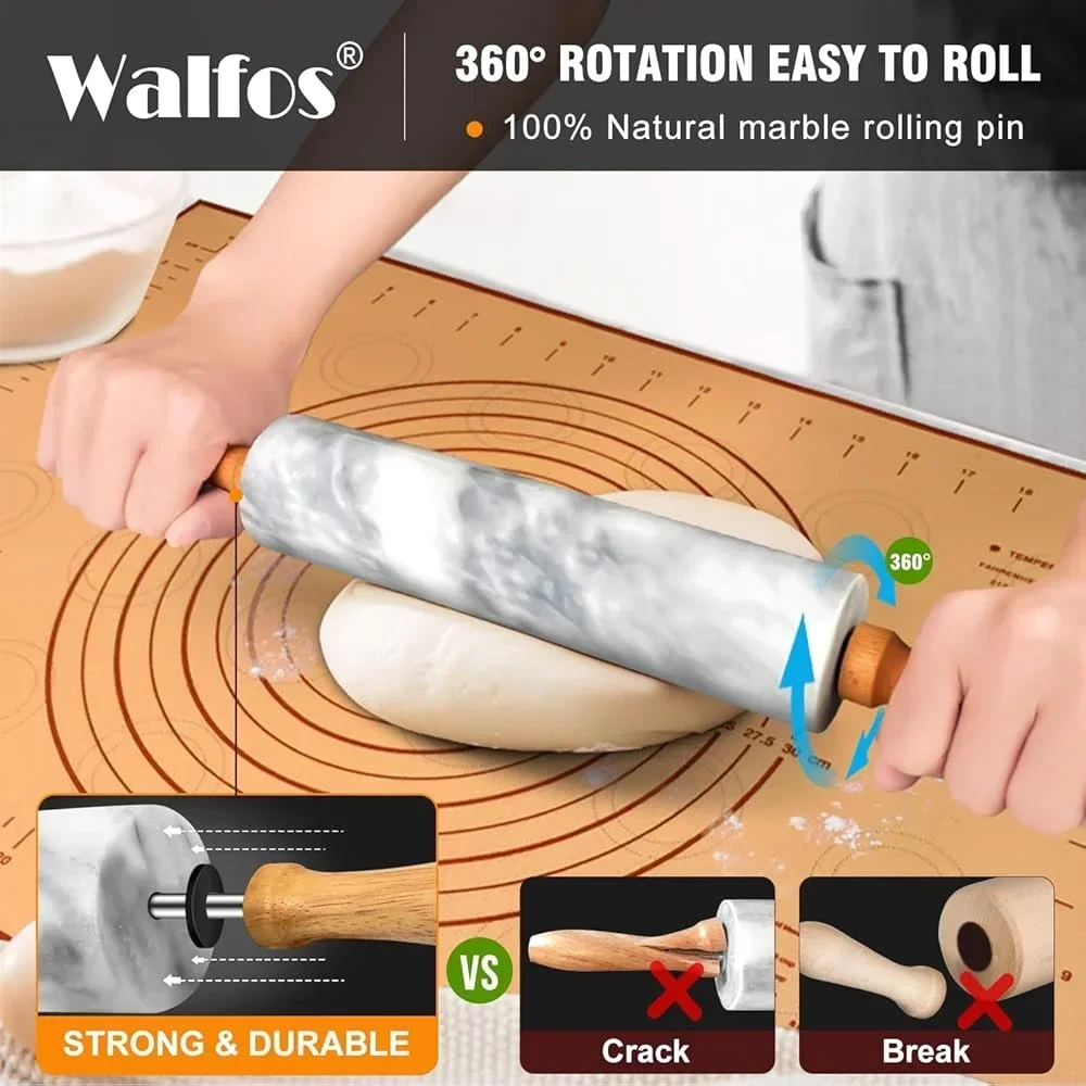 About this item ★ QUALITY MARBLE & FOOD GRADE SILICONE: marble rolling pin is 16. 55 inch with beautiful gradual gray and white. Due to the natural nature of the material, the real color may be slightly different from the image. The marble dough roller is with smooth wooden handles for a comfortable grip and includes a wooden bracket for protecting and holding the rolling pin. The baking pastry mat is made of food grade silicone and fiber, BPA-free and non-toxic. Each marble rolling pin set will have a unique color and pattern to decorate your kitchen. ★ UNIQUE DESIGNS & VERSATILE BAKING GIFT: The marble rolling pins are combined with quality stainless steel bearings and smooth wooden handles. The rubber rings at the joint makes it rolling as smooth as possible, allows to roll 360 degrees. The 2. 7 pounds marble rolling pin conforms to the weight of body mechanics, making it heavier, more durable & stronger than wood rolling pins. It takes very little pressure to roll out the perfect dough. Marble rolling pin set is an ideal tool for making pie crusts, cookies, breads, pizzas, pie, pasta, etc. ★ FOOD GRADE SILICONE & BAKING PASTRY MAT: thicken food grade silicone baking pastry mats have anti stick surface and non slip bottom. It has accurate scale, helps you to measure the foods better. The extra large baking mat keeps worktop clean. The baking mat is high temperature resistant, heatproof up to 450℉, can be used in oven safely. It is good for pastry mat, table mat, baking mat ,pizza pad and countertop mat. The marble rolling pin meets all your cooking and baking needs. It can also be used as a baked gift for family or friends. ★ EASY TO CLEAN & NON-STICK: Hand polished dough roller made from quality natural marble, smooth surface and cool properties offer non-stick rolling compared to wooden rolling pins. It does not absorb grease and moisture, you can wipe it gently with a damp cloth or wash it with water after use. The baking pastry mat can be rinsed with running water or just put it in the dishwasher to save your time. – We have quality guarantee to our kitchen baking pastry mat and marble rolling pin set. aims to make sure all our customers are satisfied with our product and brings all our customers a happy purchasing experience with our professional services.