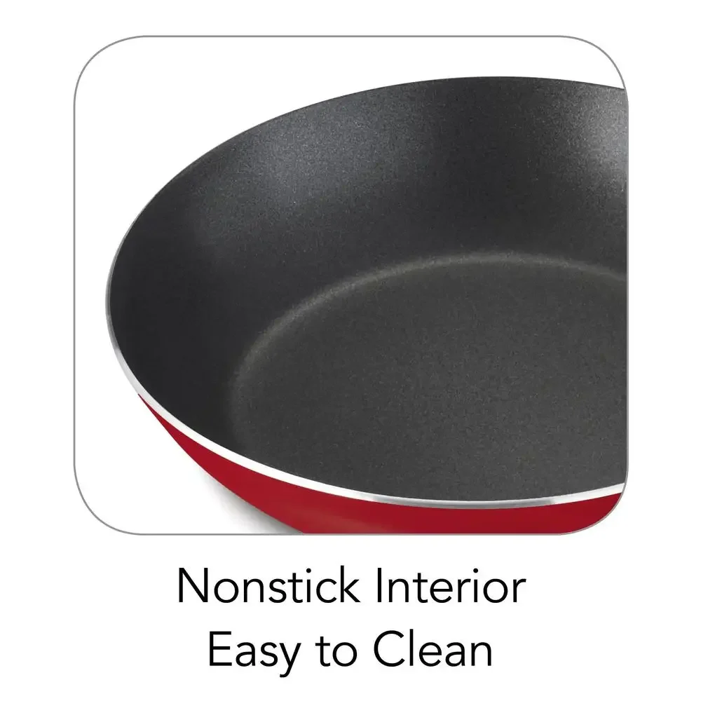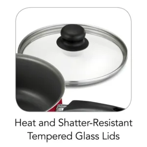Tramontina 9-Piece Non-stick Cookware Set, Red: 7″ saute pan 9″ covered deep saute pan 1 qt covered sauce pan 2 qt covered sauce pan 4 qt covered Dutch oven Nonstick interiors are easy to clean Fantastic starter set including all of the essential pans for everyday cooking Riveted handles allow for easy, safe handling Heat and shatter-resistant tempered glass lids Pans and lids are both dishwasher-safe for effortless cleanup Mfr. model # 80112/646 Nine pans with lids per unit Stackable design for compact storage Available finishes: red, polished Heats up quickly for easy use with gas, electric, and ceramic glass cooktops