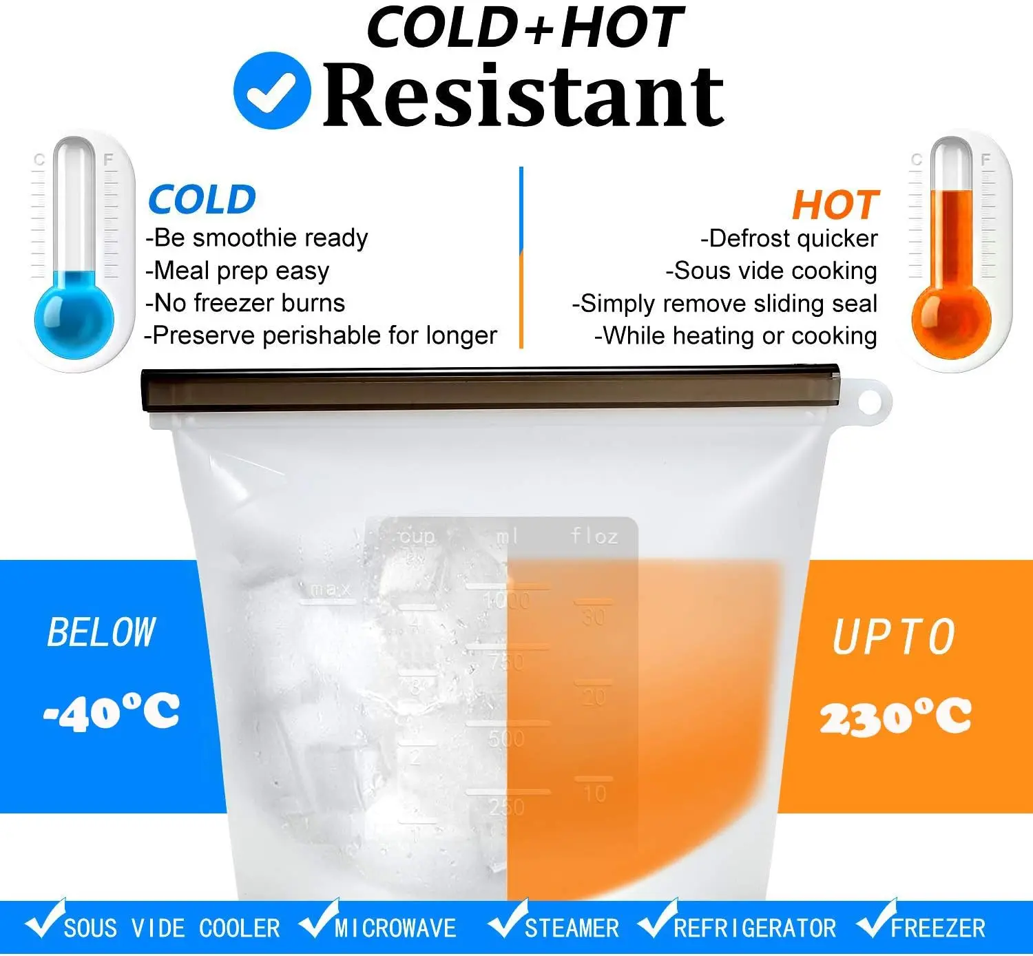 From freezer to microwave to oven, silicone bags are heat & cold resistant (-58° to 482°) unlike PEVA & -lock alternatives. Save money on single-use plastics and reuse the bags for marinating, sous vide, snacks, baby food, leftovers and more